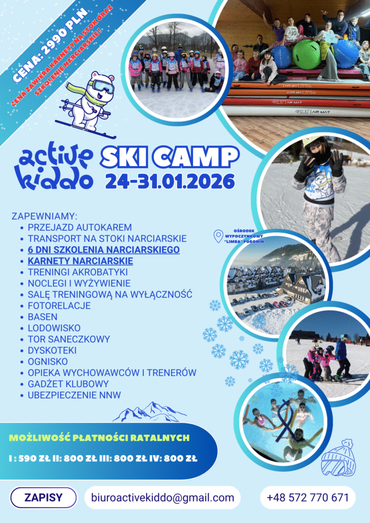 Zapraszamy na zimowy obóz narciarsko-akrobatyczny ACTIVE KIDDO SKI CAMP 2026! ❄️⛷️ To doskonała okazja, aby dzieci spędziły ferie w aktywny i pełen wrażeń sposób, ucząc się jazdy na nartach, akrobatyki oraz korzystając z różnych atrakcji na śniegu i lodzie.
